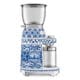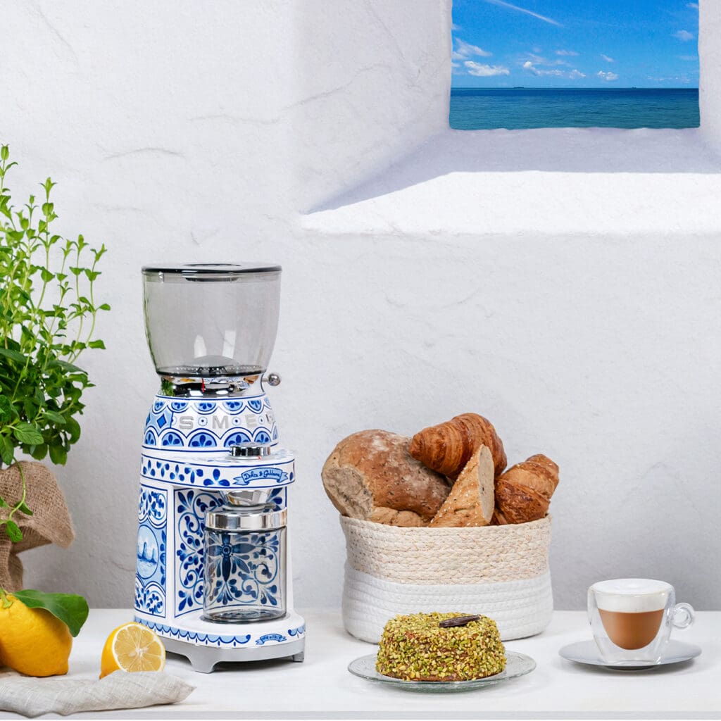 Blu Mediterraneo, Smeg & Dolce&Gabbana, 50's Style. Višenamjenski mlinac za kavu s konusnim oštricama od nehrđajućeg čelika: do 30 stupnjeva mljevenja za različite pripreme kave; od finog mljevenja za espresso do grubljeg mljevenja za filter kavu.