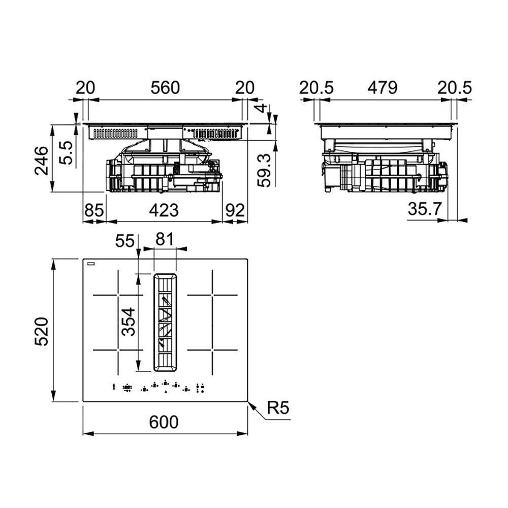 Odvod zraka sa stražnje strane. Visina cokla min. 60 mm. Isporučuje se uz filtracijsku izvedbu nape.